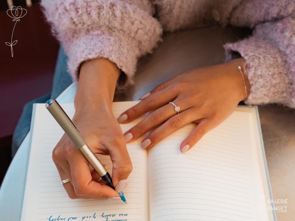 Prenez ensuite un carnet dédié que vous aurez pris soin de choisir et notez trois éléments positifs de votre journée. Il ne s’agit pas forcément d’événements extraordinaires ou de grandes réalisations : un rayon de soleil, une conversation agréable, un plat savoureux, un moment de calme, une sieste réparatrice, une permission que vous vous êtes accordée… Cette pratique, validée par de nombreuses études en psychologie positive, recâble progressivement notre cerveau pour qu’il devienne plus attentif aux aspects bénéfiques de notre quotidien, y compris aux petits moments de douceur et de repos.